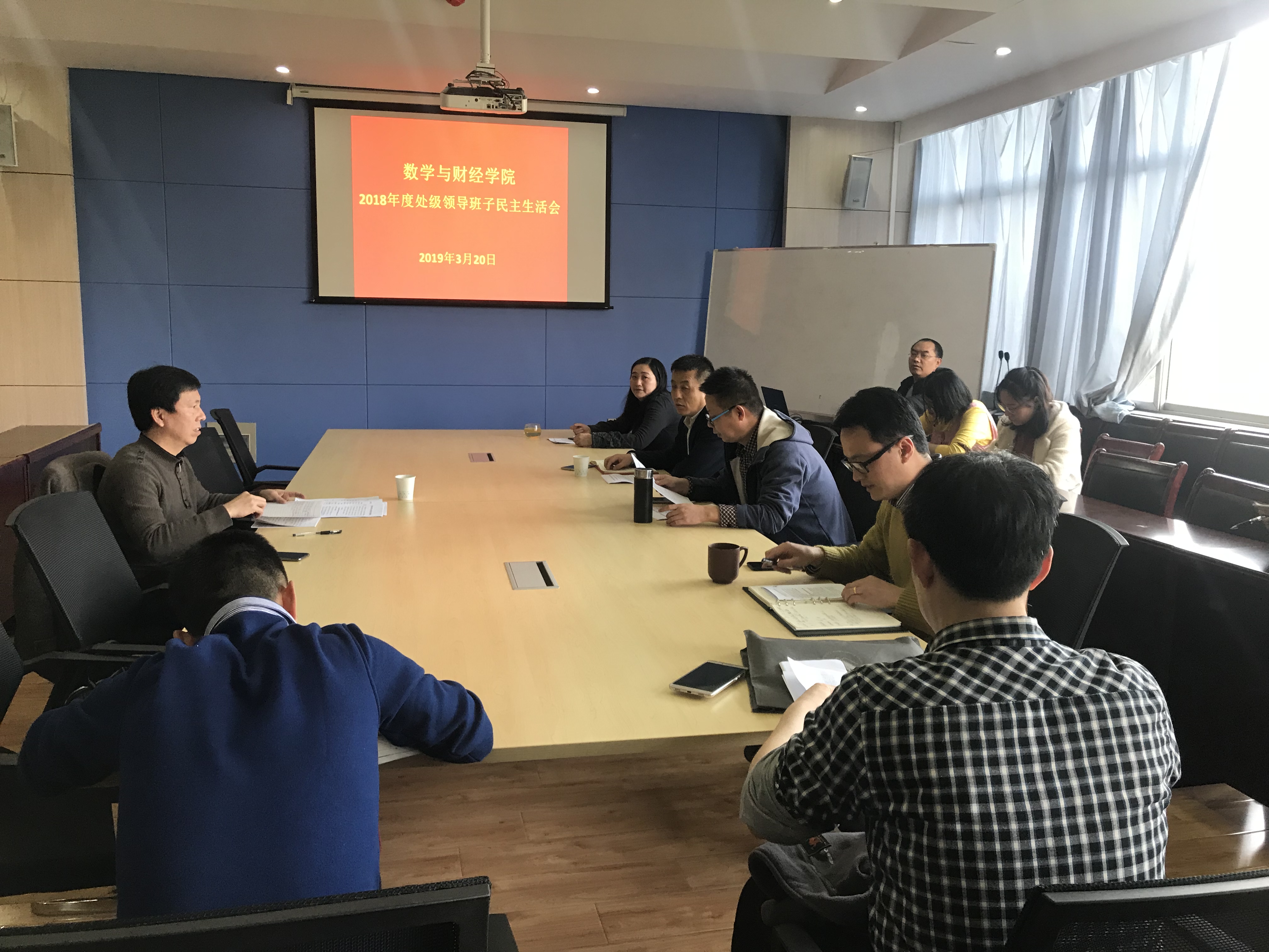 党总支书记余大鹏首先做了动员讲话并代表班子做对照检查。随后班子成员逐一做了对照检查并开展了批评和自我批评。教工部长周洪亮做了总结讲话,充分肯定了本次民主生活会准备充分、形式规范,是一次成功的民主生活会;肯定了班子成员能直面为题,批评和自我批评能见人见事见思想见作风;他希望数学与财经学院能认真梳理、建立台账、扎实整改,能夯实基础、强化管理、适应发展,能凝聚力量、整合资源、创新突破。最后余大鹏书记代表班子表态将严格按照学校要求、周洪亮部长所提意见和建议扎实整改,力争2019年党建有突破,教学有成效,科研有作为,用成绩来回应本次民主生活会。