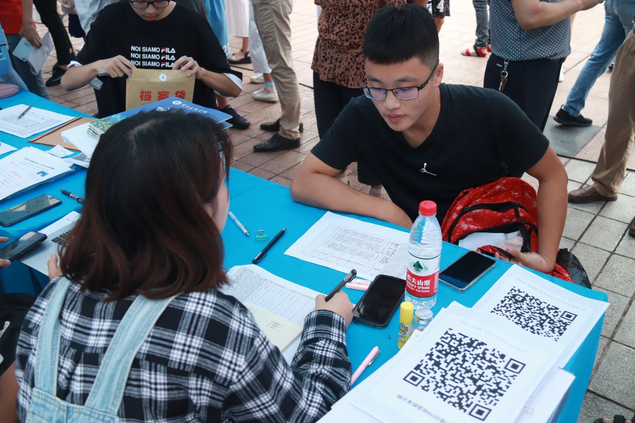 8日早上7:30,迎新报道现场各项工作早已布置妥当,学院相关部门的迎新工作人员和志愿者们也已各就各位,2019级新生陆续到来,在迎新老师和学生志愿者的引导下,有条不紊的办理报道手续。热心的志愿者们统一佩戴工作牌,个个精神饱满,集中分布在学校的北门、西门、南门及学海广场轮流等候,将新生带领至学海广场相应专业报道且引导他们办理宿舍入住、“绿色通道”、校园卡激活等事项,解决他们遇到的问题,给予新生最方便快捷的指引,让他们尽快了解学校与学院,适应新环境。
