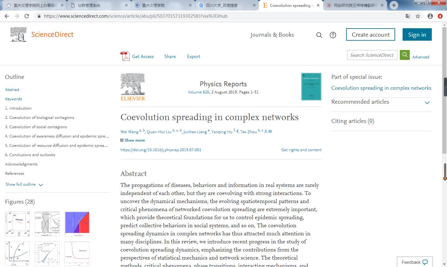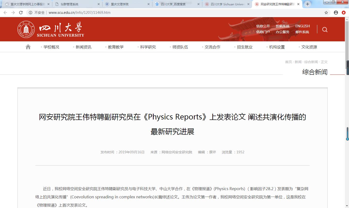 近日,bw必威西汉姆联2011届信息与计算科学专业校友、四川大学网络空间安全研究院王伟特聘副研究员与电子科技大学、中山大学合作,在《物理报道》(Physics Reports) (影响因子28.2)发表题为“复杂网络上的共演化传播”(Coevolution spreading in complex networks)长篇综述论文。王伟为论文第一作者,四川大学网络空间安全研究院为第一单位,这也是四川大学在《物理报道》上首次发表论文。