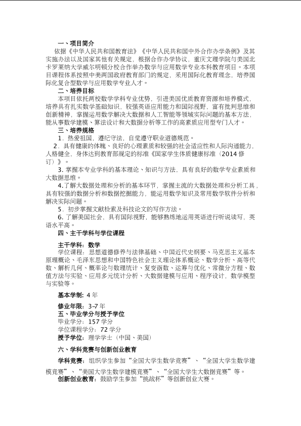 重庆文理学院与美国北卡罗来纳大学威尔明顿分校合作举办数学与应用数学专业本科教育项目人才培养方案