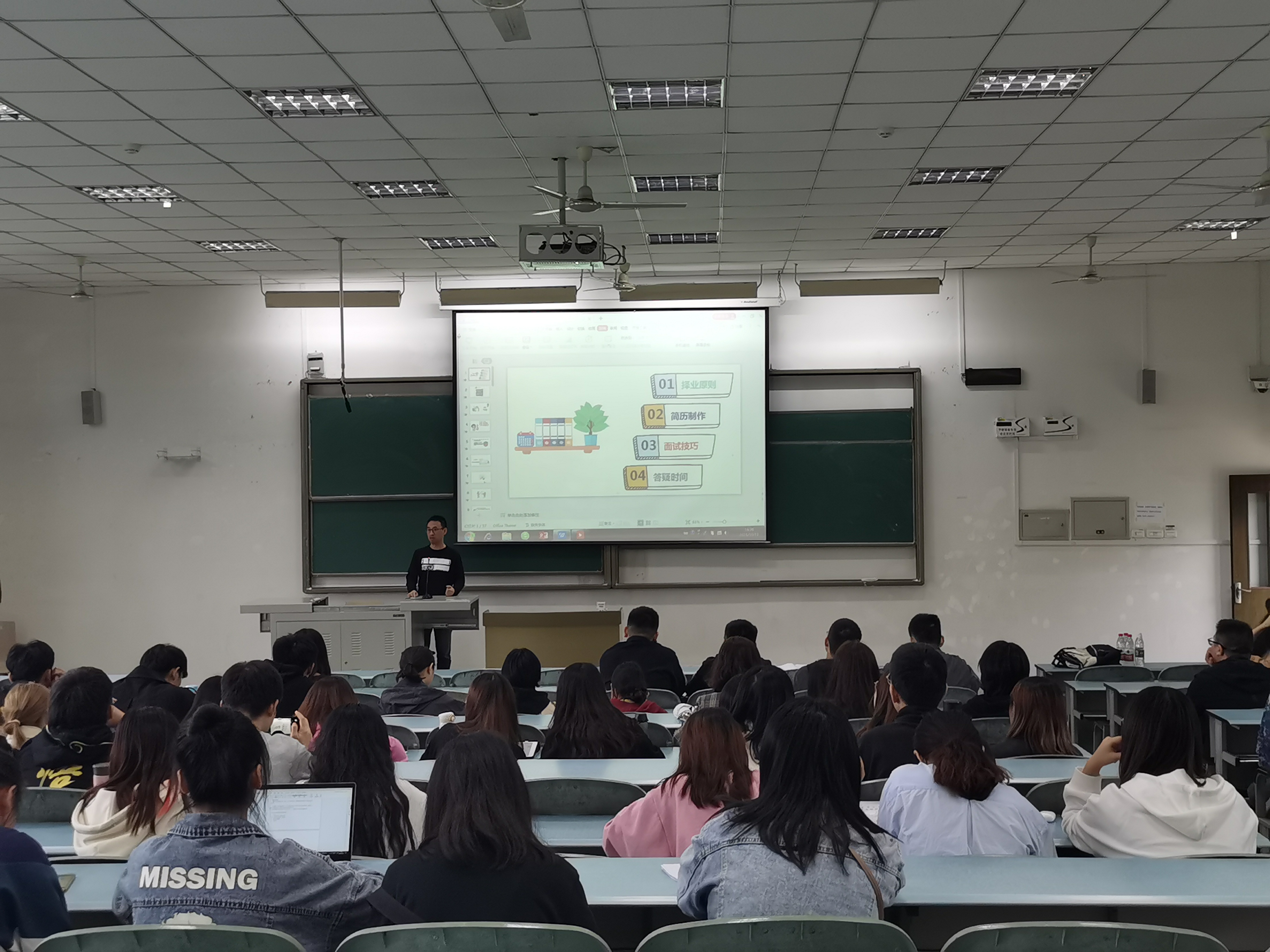 黄华副书记首先介绍了简历的重要性,作为应聘的敲门砖,是每位求职者的必备要件。他建议同学们面对不同的应聘,针对性地修改简历,提高面试率。他要求同学们在简历上下功夫,做到让招聘人员眼前一亮,为自己的职业生涯赢得光明前景。葛润峰老师从择业原则、简历制作、面试技巧三个方面为同学们做培训,着重讲解了简历制作,特别详细地介绍了简历的五大组成部分以及制作简历的五大原则,他希望同学利用课余时间仔细打磨求职简历,为求职打下坚实基础。
