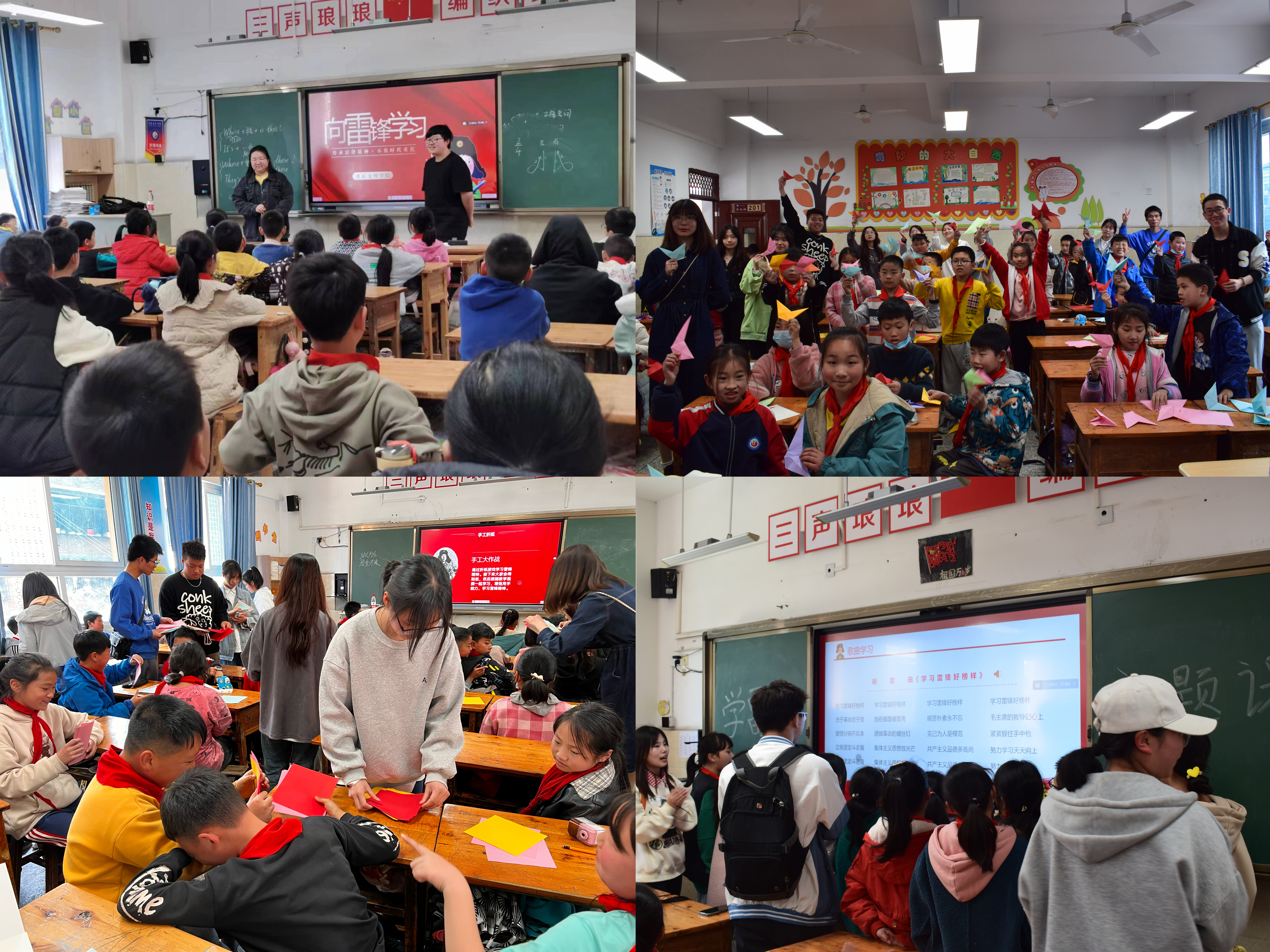 活动中,学院志愿服务队员分组到小学课堂,通过讲述新时代雷锋故事、合唱雷锋歌曲、教学五角星折纸和开展知识问答,帮助小朋友们进一步了解雷锋事迹,对雷锋精神有更深的认识。活动最后,学院领导老师为小朋友们赠送了书籍和学习用品,鼓励大家学习雷锋精神。