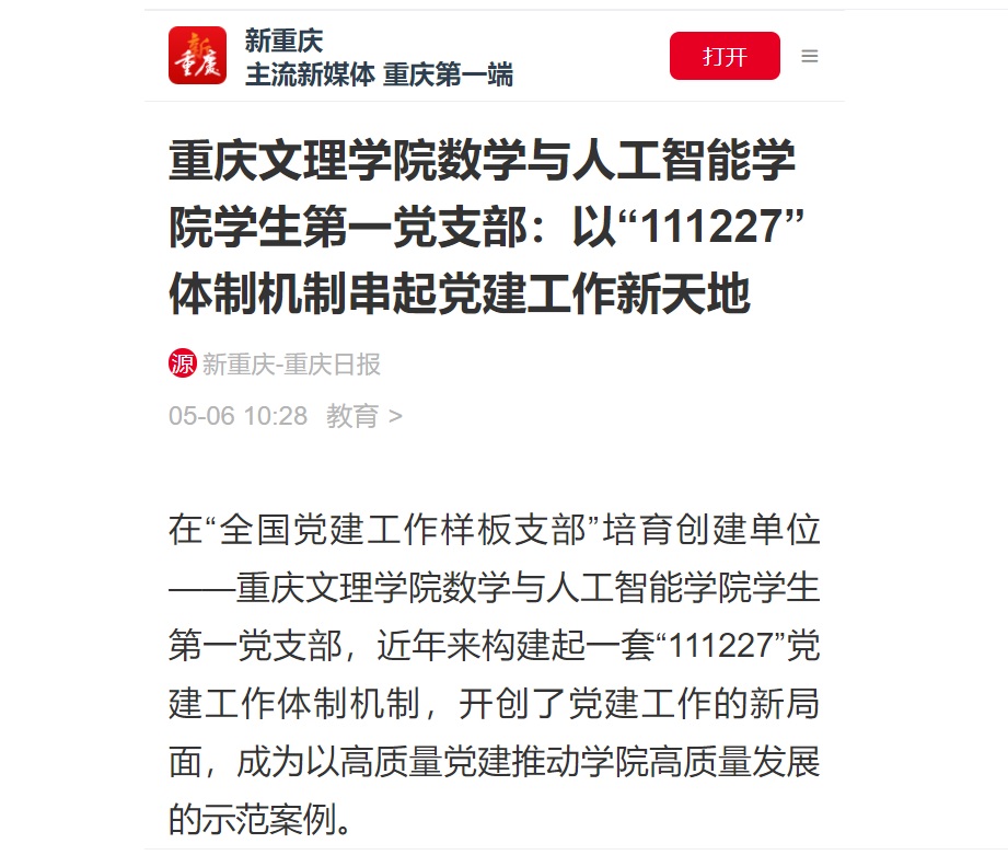 5月6日,新重庆-重庆日报以《重庆文理学院betway88西汉姆联学生第一党支部:以“111227”体制机制串起必威西汉姆联新天地》(撰稿人:杨加强)为题,对bw必威西汉姆联学生第一党支部“全国必威西汉姆联样板支部”培育创建工作进行了宣传报道。