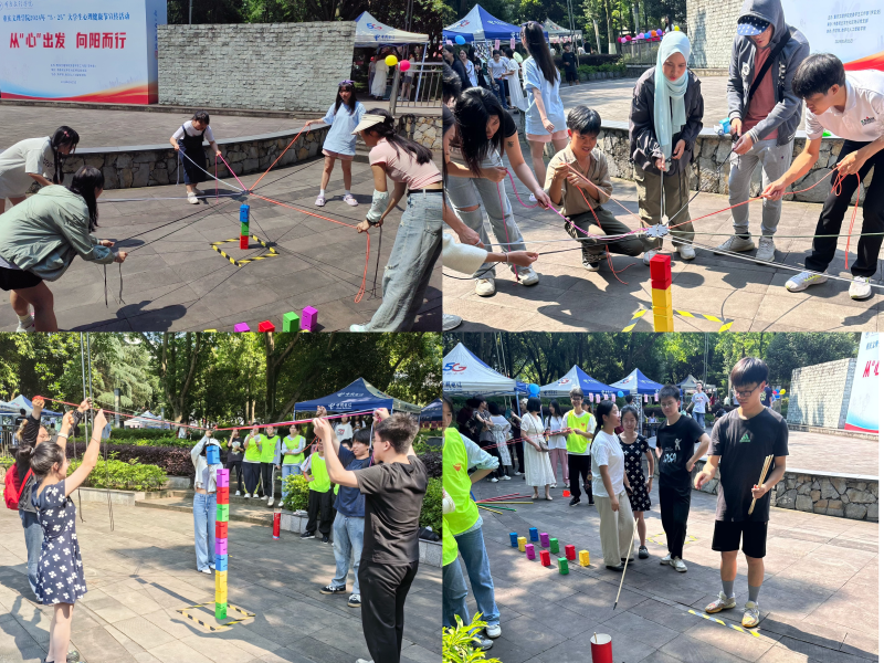 bw必威西汉姆联“快乐同行”素质拓展工作室协办了此次活动的素质拓展体验项目,项目设置了投壶、合力搭建、不倒森林、轨道运球等个人和团队体验活动。活动现场同学们积极参与,跃跃欲试,尤其是合力搭建项目,深受喜欢。同学们拉着手中的绳子,用吊钩把一块块彩色的积木小心翼翼的叠在一起,最后成功搭建在一起。虽然天气炎热,但同学们脸上都洋溢着灿烂的笑容,沉浸在一片欢乐和谐的氛围中。